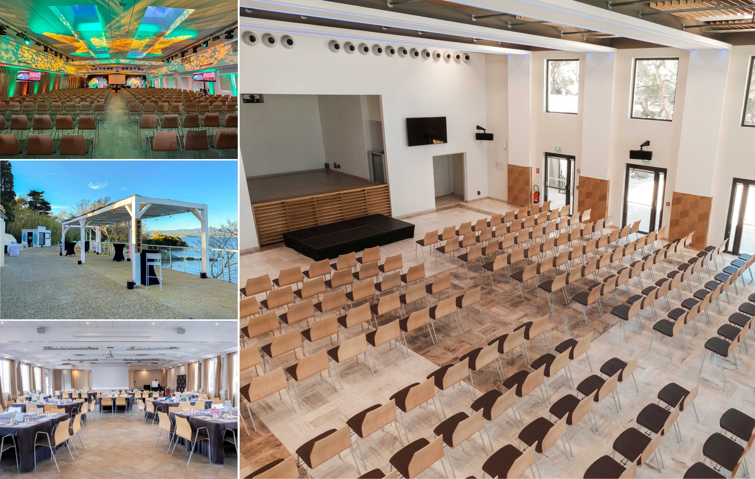 Extérieurs : profitez de nos nombreux espaces extérieurs pour vos pauses, repas ou activités. Ces espaces uniques sous les pins de la pinède, sur une esplanade surplombant une plage ou encore sur une terrasse face au port des Embiez offrent un cadre exceptionnel pour des moments de détente ou de networking.