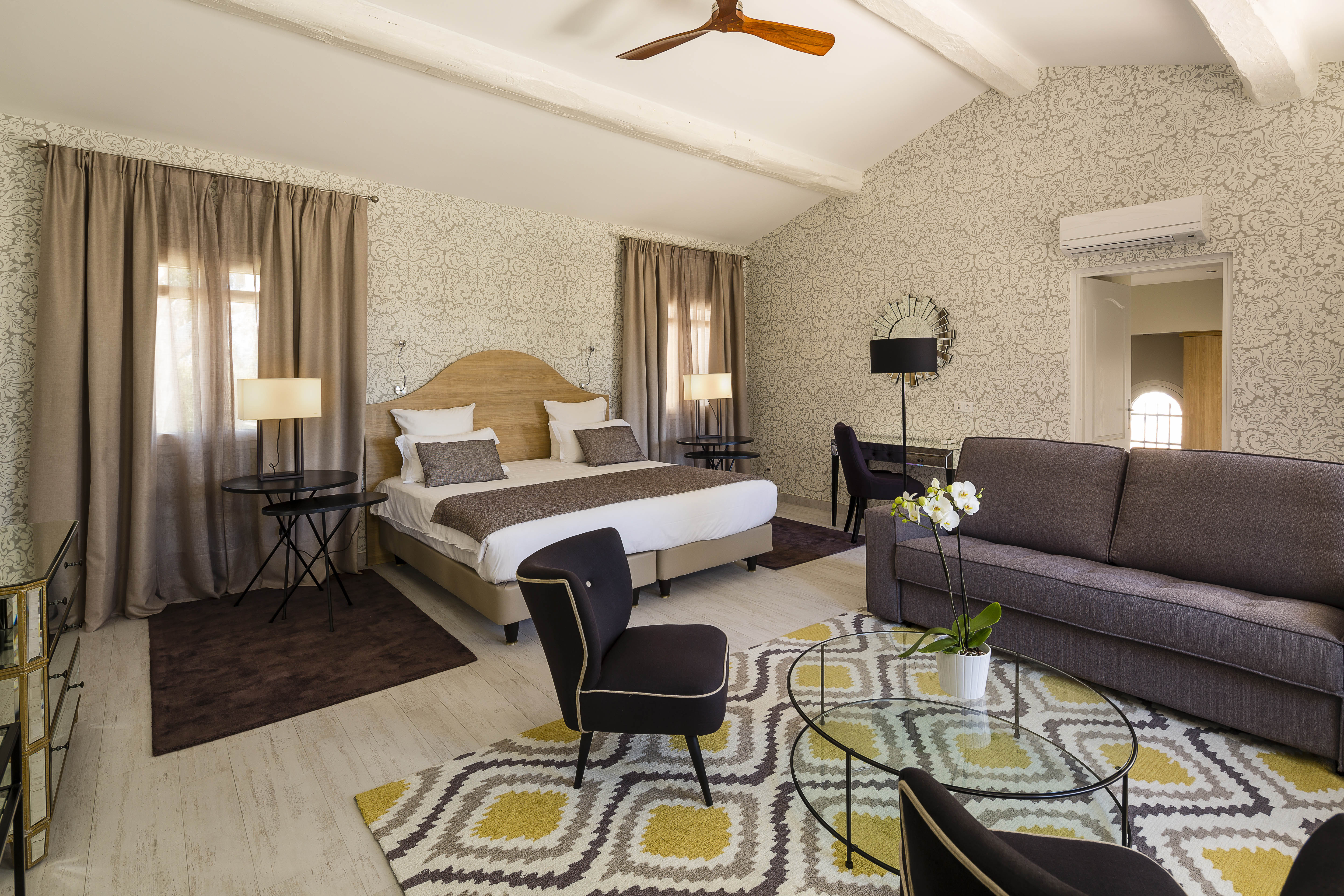 Within 100m of the hotel, air-conditioned suite approx. 30m², on the ground floor with terrace. Comprising one double or twin beds, bathroom with bath, double washbasin, toilet and hair dryer, dressing room, lounge with sofa bed, arm chairs and desk, snacking area with crockery, microwave and Nespresso coffee maker.